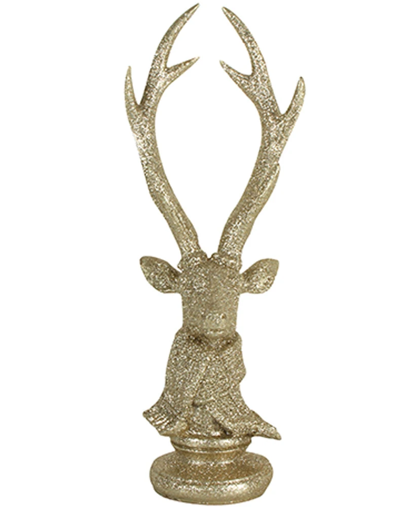 Decorate your Christmas party with our Christmas Resin Reindeer Head 32cm. Featuring a reindeer statue with gold glitter, large antlers, wearing a cloak, all on a flat base. Combine with our range of Christmas party supplies for a coordinated look.