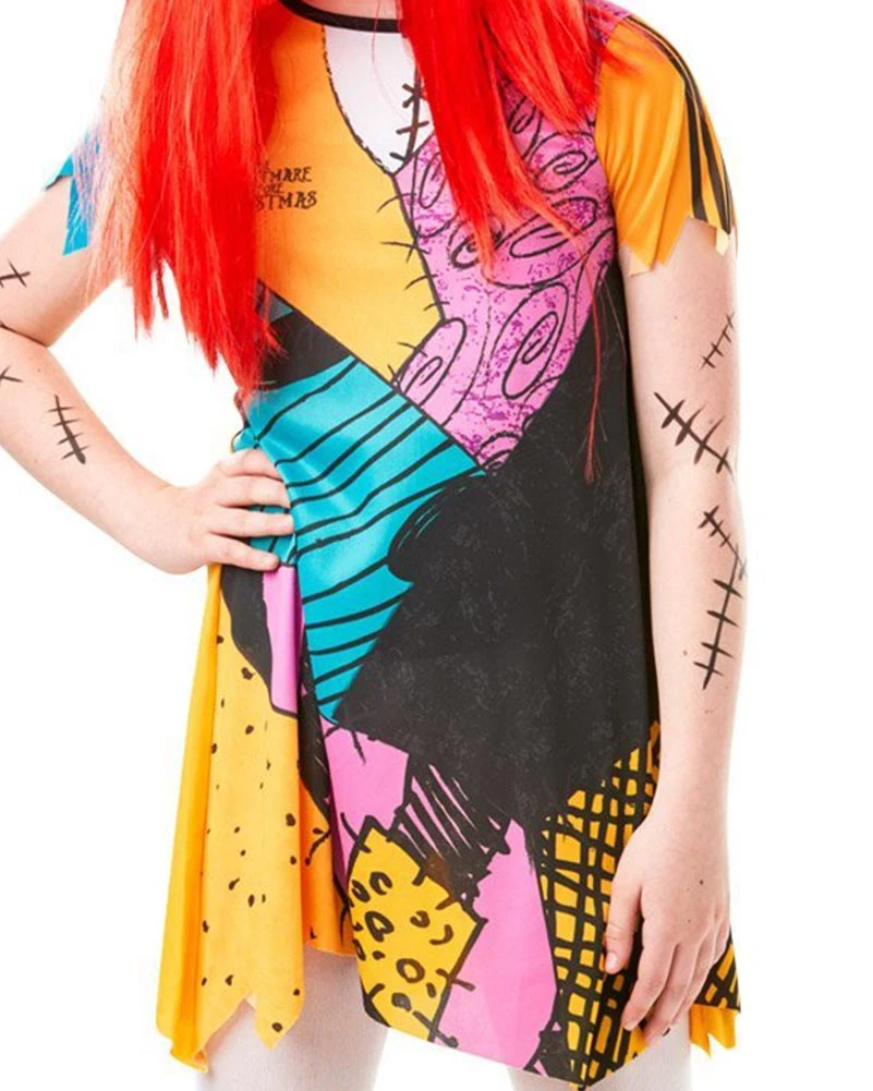 Find yourself singing along with your best friend through the field of pumpkins in this Disney Nightmare Before Christmas Sally Girls Costume, just in time for Halloween night. This movie style costume includes a ragged dress in colours teal, yellow, pink and black printed to look like just like Sally’s in the film Nightmare Before Christmas and a long vibrant red wig with a middle part. This rag doll stars in the classic film by Tim Burton about the little town called Halloweentown where all spooky characters live, from vampires, scary clowns, skeletons and other individuals you will only meet during Halloween. Sally was brought to life by her creator and the only scientist of the town, Dr Finkelstein, who after creating Sally tries to confine her to his lab. Sally soon falls in love with the towns pumpkin king, Jack Skellington and together become the perfect couple and live happily together.
