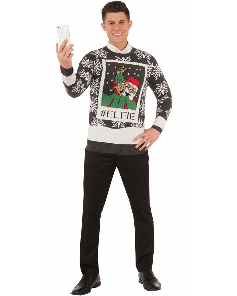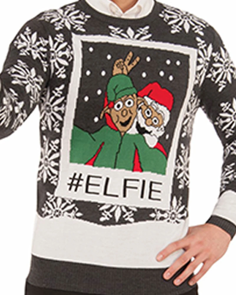 Why not do your look this Christmas a little differently with this hilarious Christmas Elfie Mens Sweater! This sweater features white snow flakes and the design of a polaroid of two elves and the text “#ELFIE.” Festive and funny!