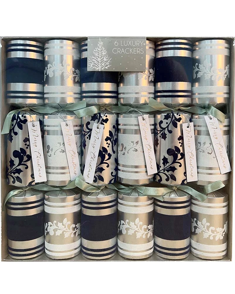 Grab yourself this Hamptons Holiday with Ribbon Christmas Crackers Pack of 6 for the table and a step away from the traditional red and green colour scheme. This pack contains six crackers (or bonbons) in colours silver with blue and white stripes and floral designs in the centre. When cracked open, each of the crackers contains small prizes anyone can enjoy.