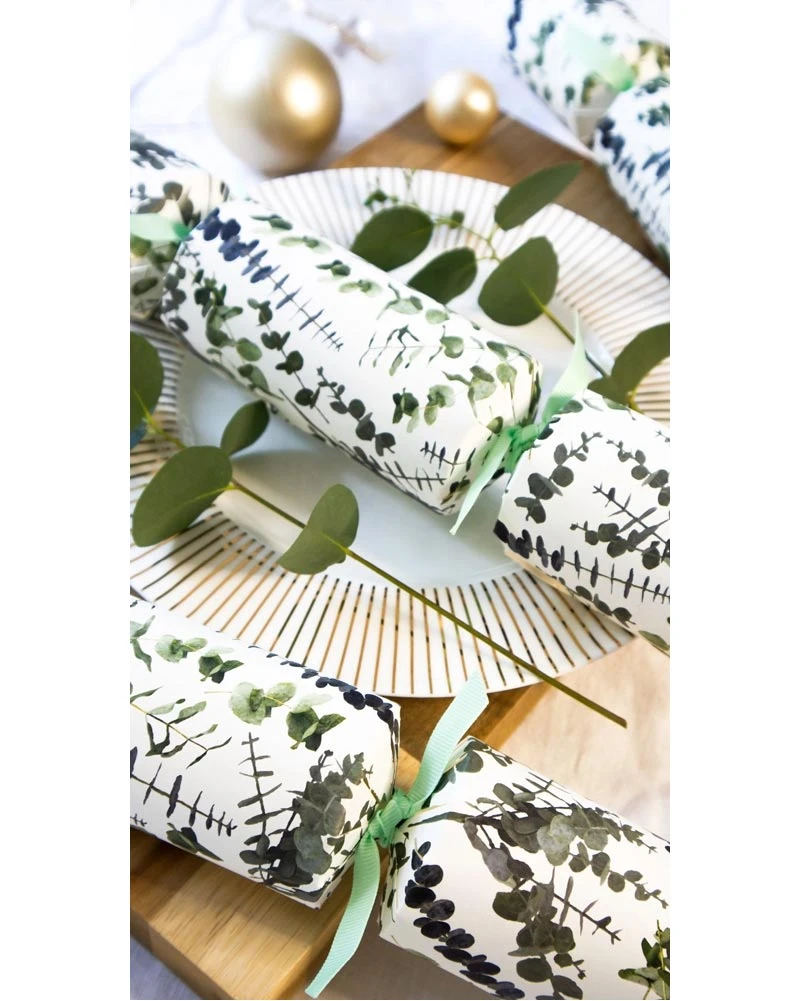 Finish off your Christmas table setting with this Kraft Eucalyptus Christmas Crackers Pack of 12. Included are 12 white kraft Christmas crackers with a green leaf eucalyptus design and a pale green ribbon tie. The crackers contain a reusable prize, hat and amusing joke/motto. This product is FSC certified and has 100% recyclable packaging and cracker barrels, so you can have fun whilst doing your bit for the environment.