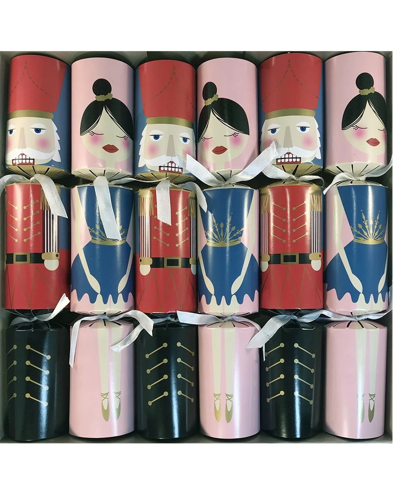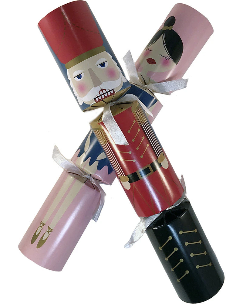 Bring a Christmas tradition to your table setting and hand to each of your guests a bonbon. These bonbons (or crackers) feature two printed images; one is of a ballerina wearing a blue dress in front of a pink background and the other is of the Nutcrackers in his red uniform and standing in front of a blue background. When crackered open, each of these crackers contains a small toy.
