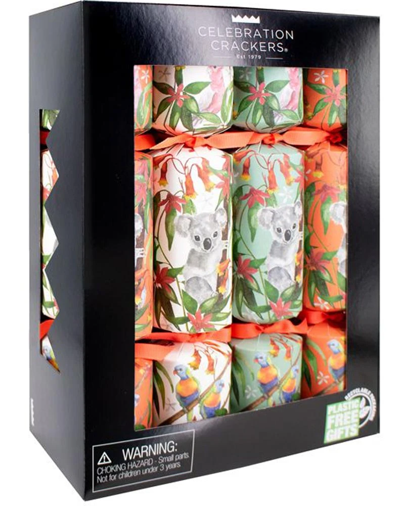 When you have Christmas lunch you can’t go wrong with our Tropical Koala Deluxe Christmas Crackers Pack of 8. Featuring a pack of 8 deluxe Christmas crackers styled with unique tropical koala illustrations with red ribbons and green and red floral prints on an assortment of red, white and light green Christmas crackers. Each cracker has a satisfying snap, contains a hat, an amusing Joke, and a great gift. Check out our range of Christmas tableware for a coordinated look.