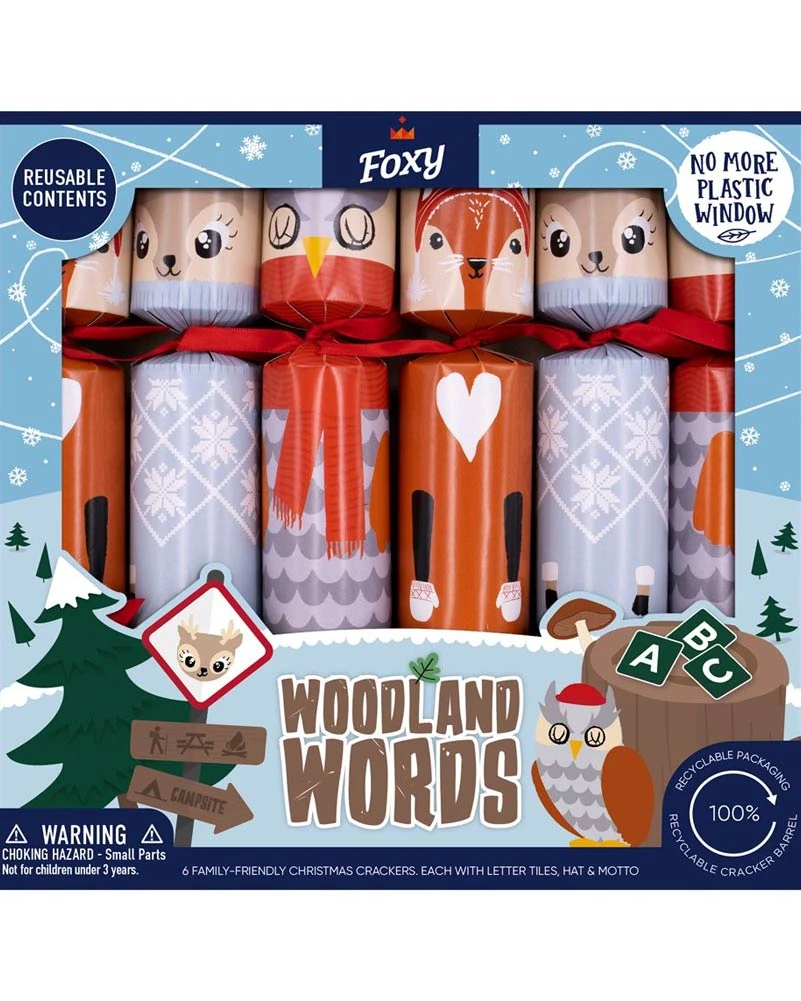 Finish off your Christmas table setting with these Woodland Words Christmas Crackers Pack of 6. Included are 6 Christmas crackers in alternating fox, dear and owl designs, each containing letter tiles, hat and motto. This product is FSC certified and has 100% recyclable packaging, cracker barrels as well as reusable contents, so you can have fun whilst doing your bit for the environment.
